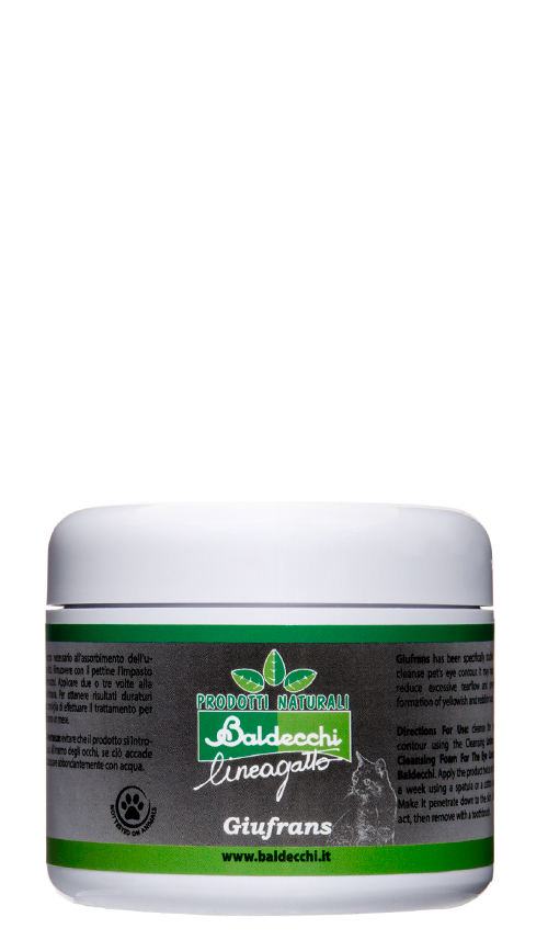 Kenmerken: Giufrans voor rond de ogen is een product dat speciaal is gemaakt voor het reinigen rond de ogen van uw kat. Het is een niet-irriterend product met een hoge huidvriendelijkheid. De extracten van Kamille en Toverhazelaar geven dit schuim een verzachtend effect, de samenwerkende krachten van Kamille en Toverhazelaar kan in sommige gevallen ook helpen met het verminderen van overmatig tranen. Het product kan ook gebruikt worden om andere delen van het lichaam te reinigen. Aanwijzingen voor gebruik: een dagelijks gebruik van het product wordt aanbevolen. Verdeel wat schuim op een wattenschijfje en reinig rond de ogen, of andere delen van het lichaam. Niet uitspoelen. U kunt ook gebruik maken van het vloeibare product door een wattenstaafje nat te maken.