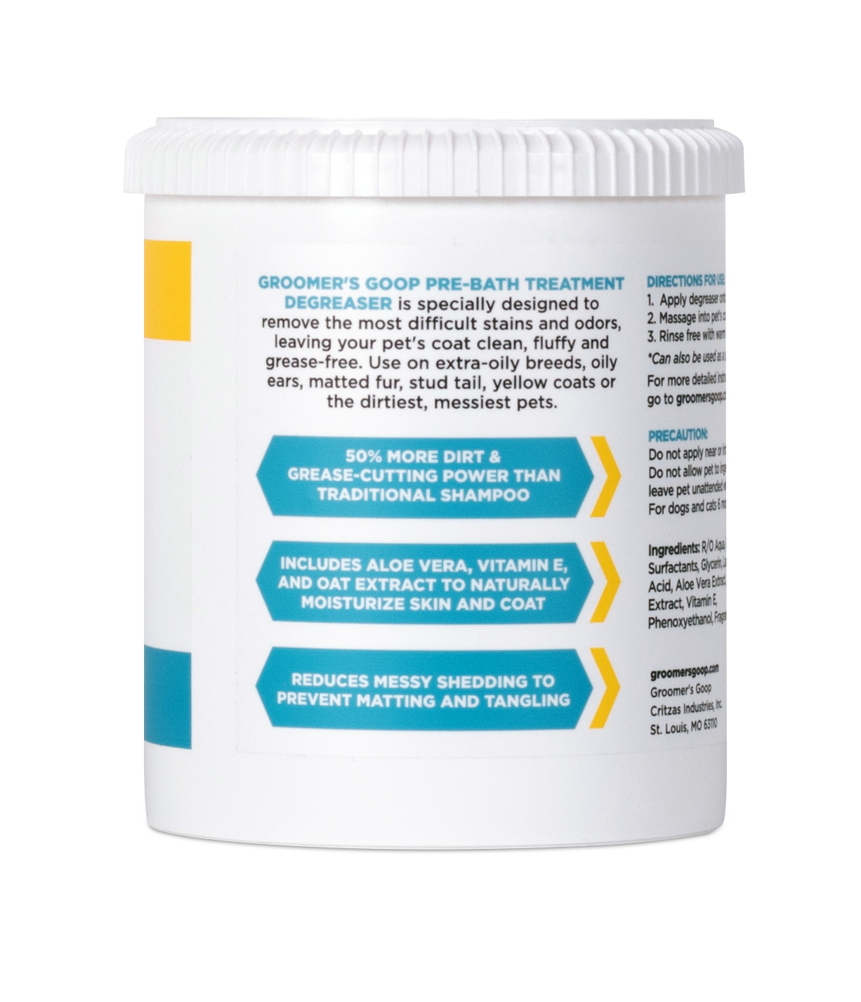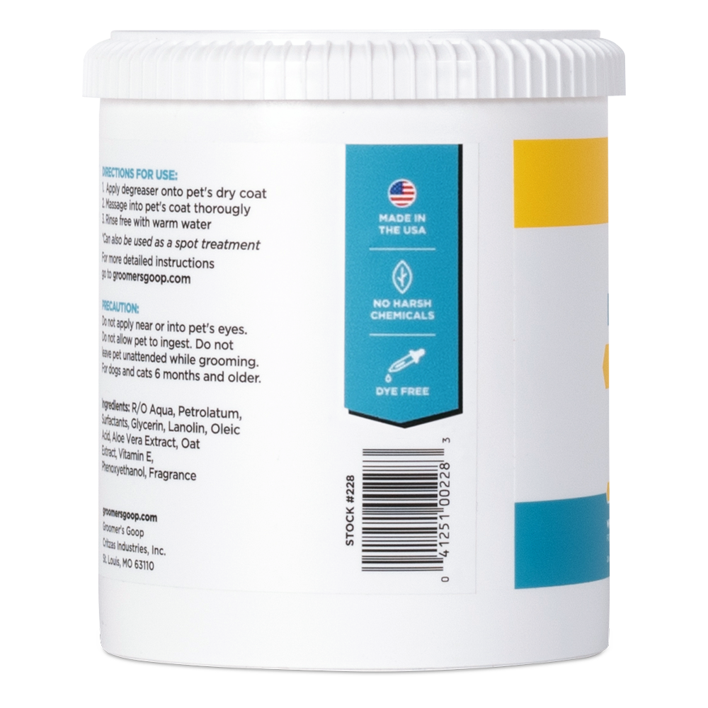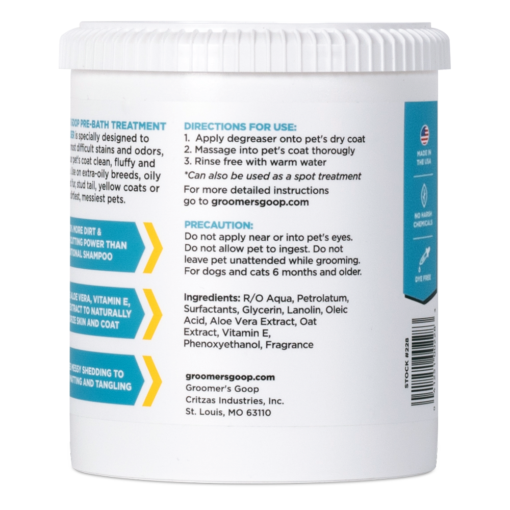 Groomer's goop is de keuze van professionals om de vachten van Perzen, Himalayans, en Maine Coon katten te ontvetten. Het is ook de keuze van fokkers en trimmers voor een krachtige schoonmaak van alle langharige honden. Niets werkt beter om smeer en olie van uw dier zijn vacht te halen. The Groomers Goop formule is speciaal ontwikkeld om het meest moeilijke vuil weg te halen en om uw dier zijn vacht schoon, mooi, en vol van lichaam en vuilvrij achter te laten. Conditioned terwijl het schoonmaakt. De verrijkte formule bevat conditioners zoals Lanoline, Glycerine, Vitamine E, en Aloe Vera. Allemaal beschermen ze de huid van uw dier terwijl ze de moeilijke schoonmaak doen, zoals een katerstaart verhelpen, of teer weghalen, sap, kauwgom, bloed, en zelfs stinkdier spray.