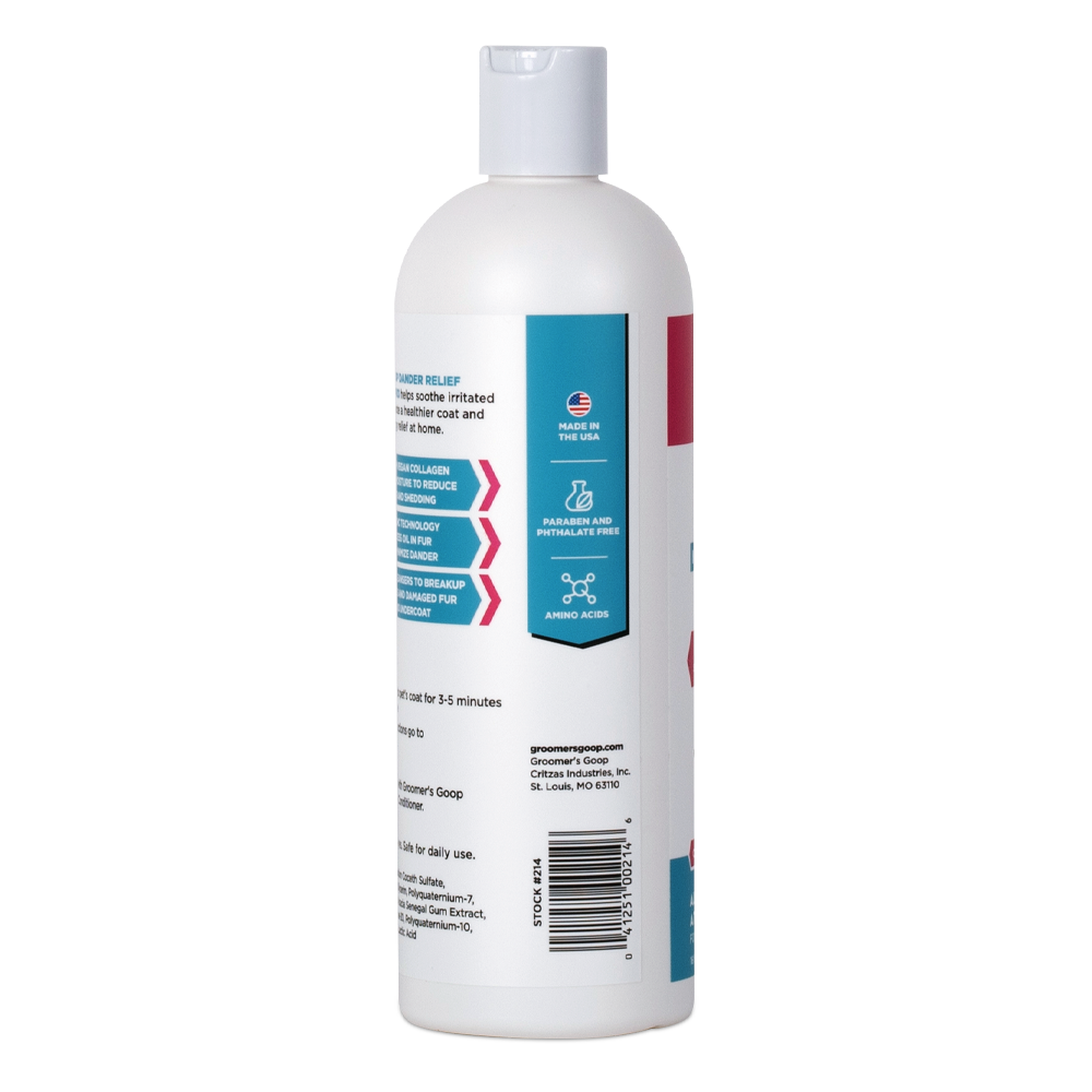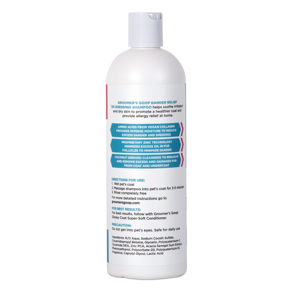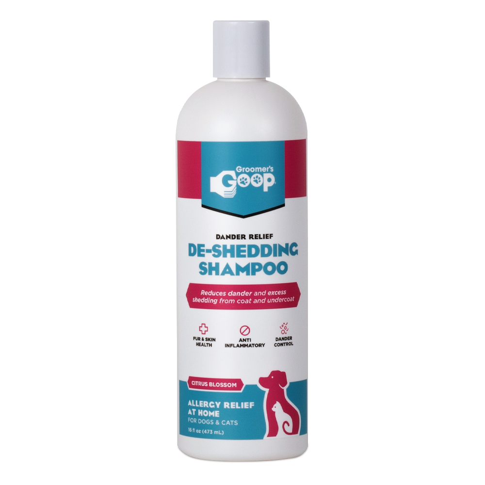 Groomer’s Goop Dander Relief De-Shedding Shampoo kalmeert geïrriteerde en droge huid, bevordert een gezondere vacht en biedt verlichting bij allergieën, gewoon thuis.